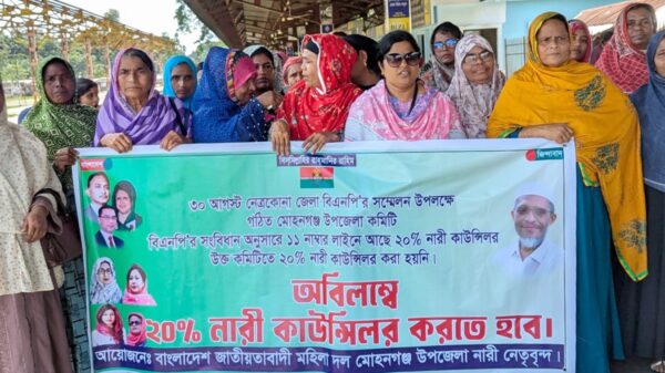 মোহনগঞ্জ প্রতিনিধিঃ নেত্রকোনার মোহনগঞ্জে ২৫ আগস্ট মোহনগঞ্জ রেল স্টেশন এলাকায় বাংলাদেশ জাতীয়তাবাদী মহিলা দল ( বিএনপি ) এর নেতৃবৃন্দ মানববন্ধন করেন। মানববন্ধন অনুষ্ঠানে নব-গঠিত মোহনগঞ্জ উপজেলা কমিটি বিএনপি’র সংবিধান অনুসারে ২০% নারী কাউন্সিলর থাকার কথা কিন্তু তাদেরকে রাখা হয়নি। তারই প্রতিবাদে বাংলাদেশ জাতীয়তাবাদী মহিলা দল, মোহনগঞ্জ উপজেলা নারী নেতৃবৃন্দের ব্যানারে মানববন্ধন করেন । মানববন্ধন কর্মসূচিতে উপস্থিত ছিলেন মহিলা দলের আগামী সম্মেলনে সভানেত্রী প্রার্থী ও সাবেক মেম্বার রেবেকা আক্তার রুবি , সাধারণ সম্পাদিকা প্রার্থী তানিয়া লাইজু রিংকি , মোহনগঞ্জ সরকারি কলেজের জাতীয়তাবাদী ছাত্রদলের সাংগঠনিক সম্পাদক তাসলিমা আক্তার প্রীতি, সাবেক মেম্বার বিলকিস আক্তার খান , স্বপ্না আক্তার, নুরনাহার, নাজমা ইসলাম, লায়লা আক্তার, শিল্পী প্রমুখ । তারা ৩০ আগস্ট জেলা বিএনপি’র সম্মেলনের আগেই সংবিধান অনুসারে ২০% নারী কাউন্সিলর মোহনগঞ্জ উপজেলা বিএনপি’র কমিটিতে অন্তর্ভূক্ত চান । বক্তারা নারী কোটা সংযোজন না করায় চরম ক্ষোভ প্রকাশ করেন ।