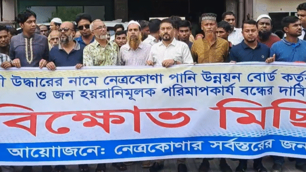 নেত্রকোণায় নদী উদ্ধারের নামে হয়রানি বন্ধের দাবিতে বিক্ষোভ