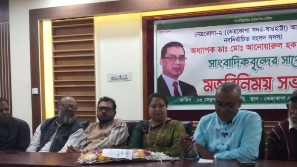বিশেষ প্রতিনিধিঃ নেত্রকোনায় সাংবাদিকদের সাথে নেত্রকোনা- ২ আসনের বিএনপি এর নবনির্বাচিত সংসদ সদস্য, জেলা বিএনপির সভাপতি ডাক্তার আনোয়ারুল হক এর মতবিনিময় সভা ১৩ ফেব্রুয়ারী নেত্রকোনা জেলা প্রেসক্লাব হলরুম অনুষ্টিত হয়েছে।